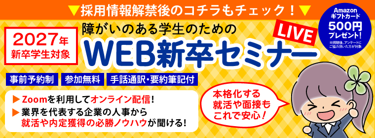 > 大学3年生はじめ全学年対象 障がいのある学生のための「業界研究・インターンシップWEBセミナー」